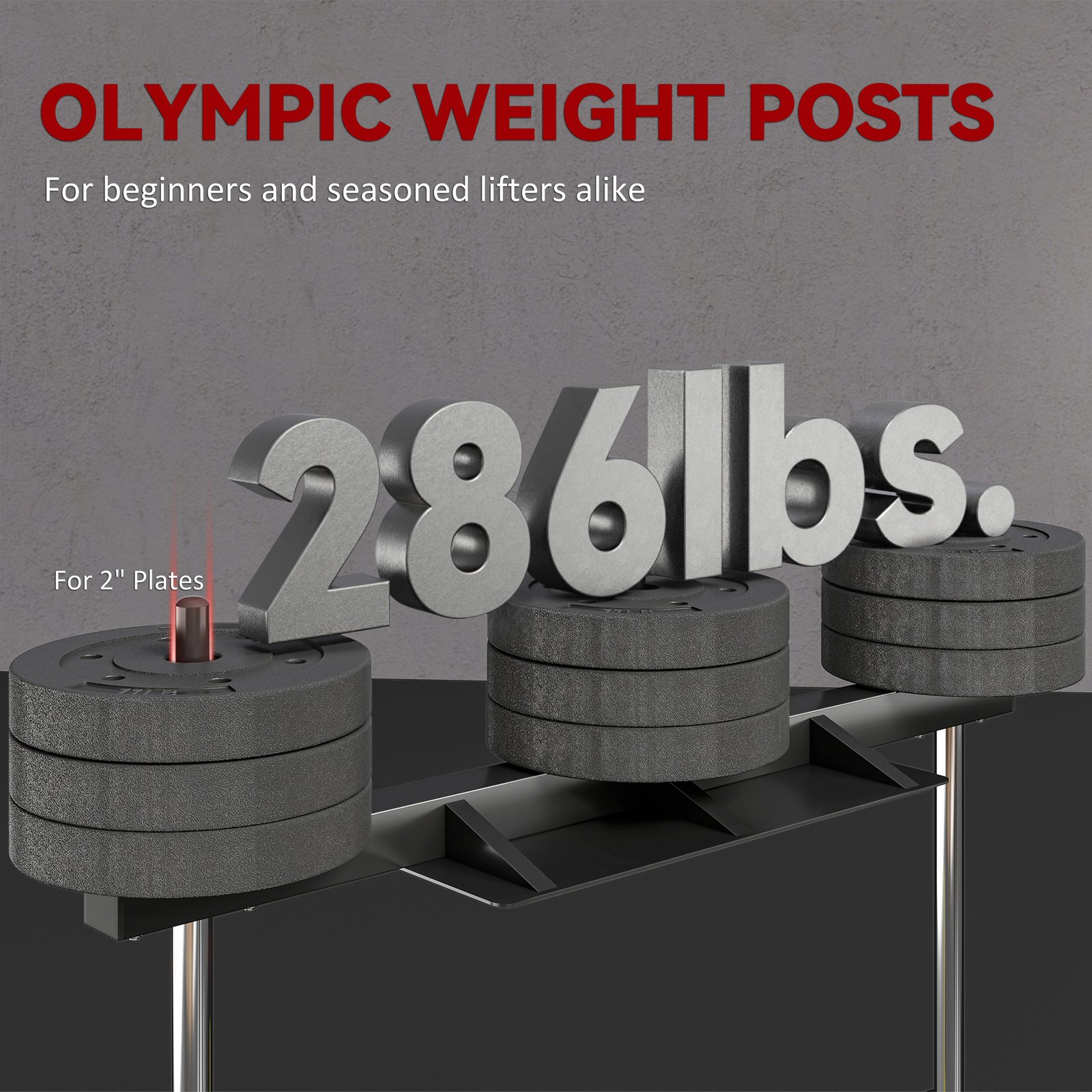 - – Accommodates three weight posts for adjustable resistance up to 286lbs.